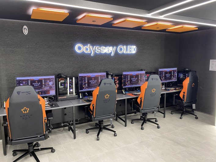 Inside, we checked the monitors and PC specs firsthand. Everything looked ready for MapleStory and a wide range of other titles. With Samsung’s sponsorship, the monitors span an OLED lineup that’s rare for typical PC bangs—Odyssey OLED G5, G6, G7, and G8. For PCs, standard seats are equipped with RTX 5070, 32GB DDR5 RAM, and AMD 7500F. Premium rooms and team rooms are fitted with RTX 5070, 32GB RAM, and AMD 9800X3D.