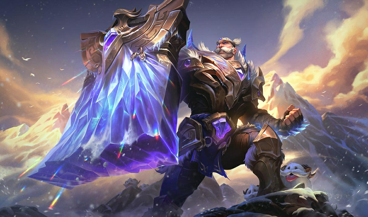 Blessed with massive biceps and an even bigger heart, Braum is a beloved hero of the Freljord. Every mead hall north of Frostheld toasts his legendary strength, said to have felled a forest of oaks in a single night, and punched an entire mountain into rubble. Bearing an enchanted vault door as his shield, Braum roams the frozen north sporting a mustachioed smile as big as his muscles—a true friend to all those in need.